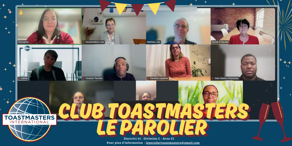 Depuis plus de 30 ans, notre club le parolier offre un environnement proactif et coopératif où les membres ont la possibilité de s’exprimer devant leurs collègues sur une base hebdomadaire. En profitant des nombreuses occasions de parler en public, vous constaterez que la timidité et le sentiment de maladresse que vous éprouviez au début diminueront progressivement.